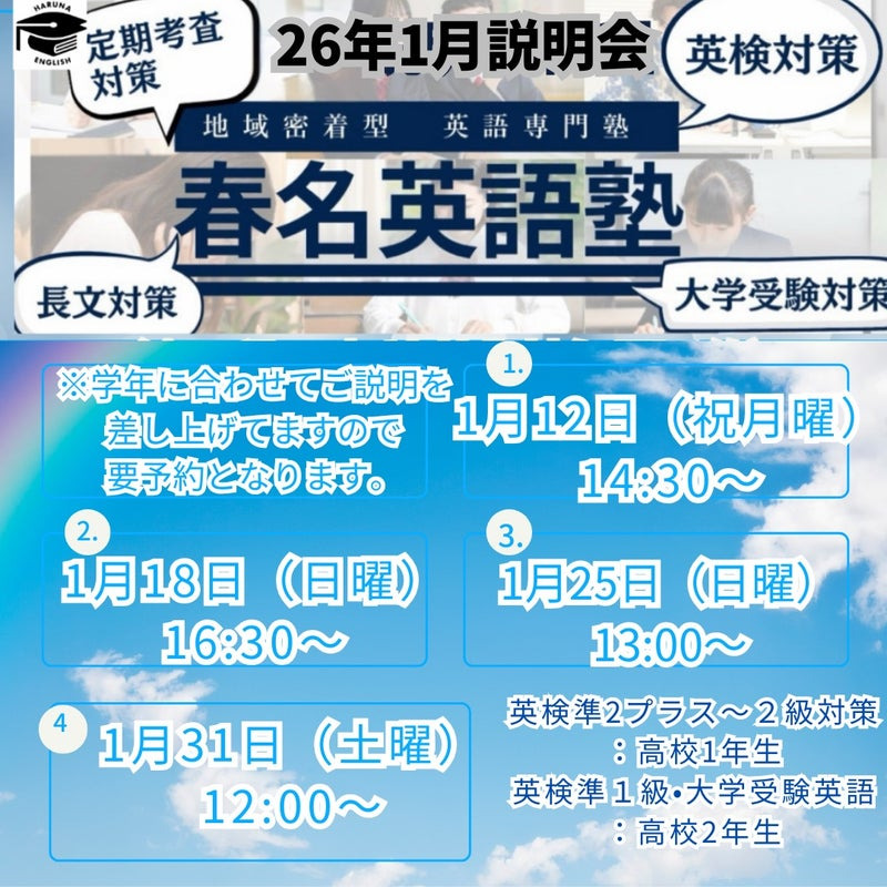 新年1月より、新高2・新高3生を対象とした学習相談・当塾説明会を実施いたします。