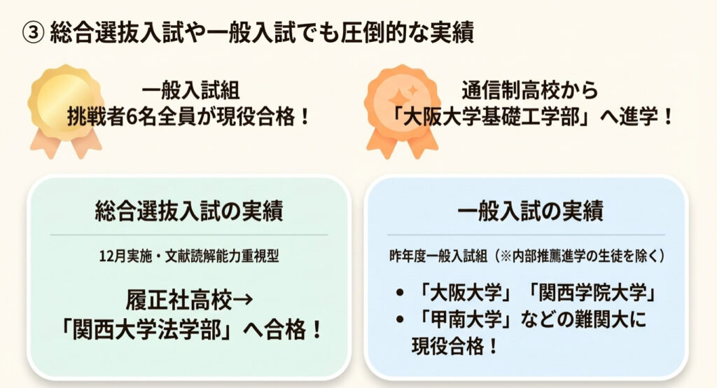 さらに昨年度の一般入試組は、英検取得による内部推薦進学の生徒を除き、挑戦した6名全員が「大阪大学」「関西学院大学」「甲南大学」などの難関大に現役合格を果たしました。通信制高校から大阪大学基礎工学部へ進学した実績もあります。
